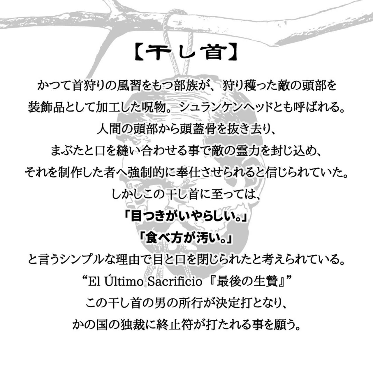 本来干し首とは首狩り族が敵の頭部を乾燥させて作る呪物。目と口を縫い合わせるのは敵の霊魂や力を封じる為ですが、この干し首はシンプルに嫌らしい目と汚い食べ方をする口を塞いだだけなのかもしれません。